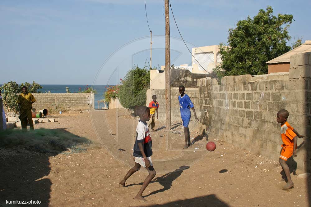 Enfants jouant au football dans une ruelle
