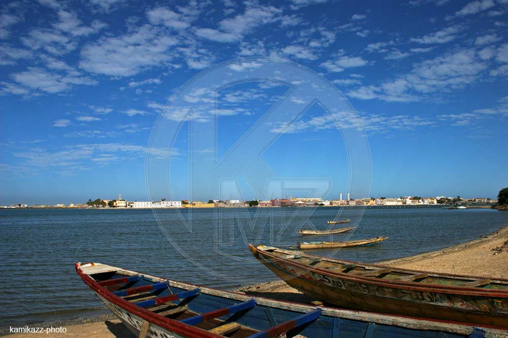 Accueil / Catalogue / Villes, villages, monuments / Pirogue devant l’île de Saint-Louis du Sénégal